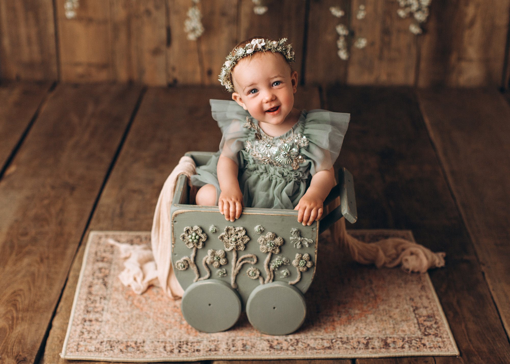 Baby Wagon with Crochet Flowers in Olive Green
